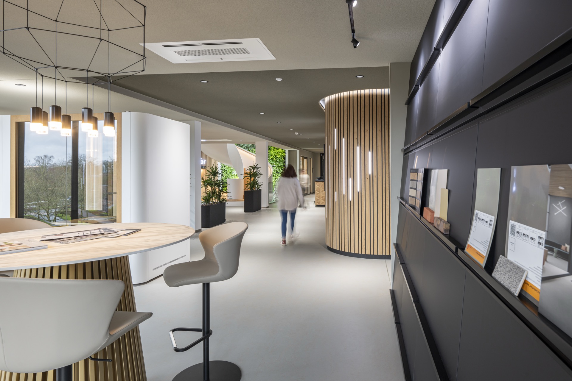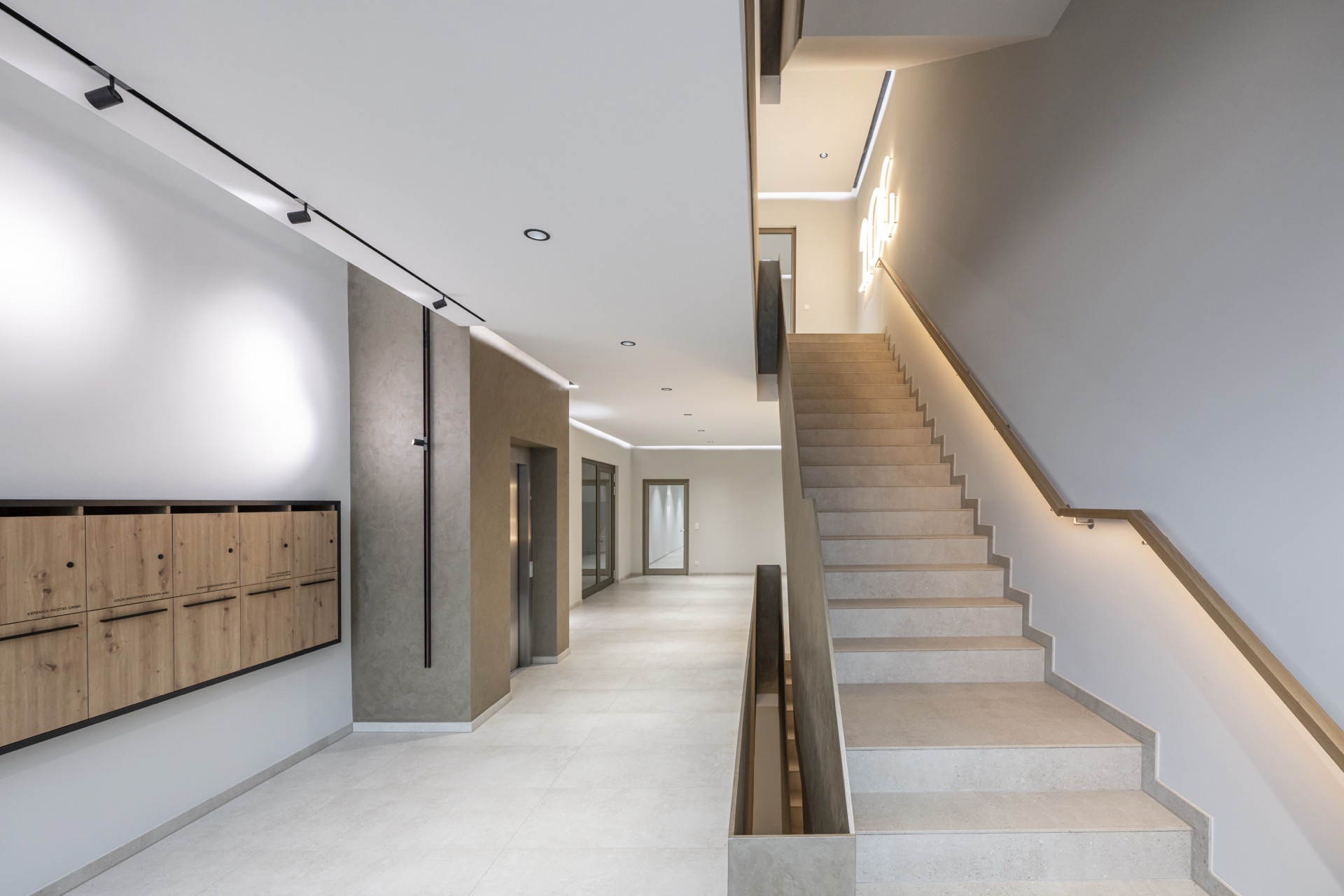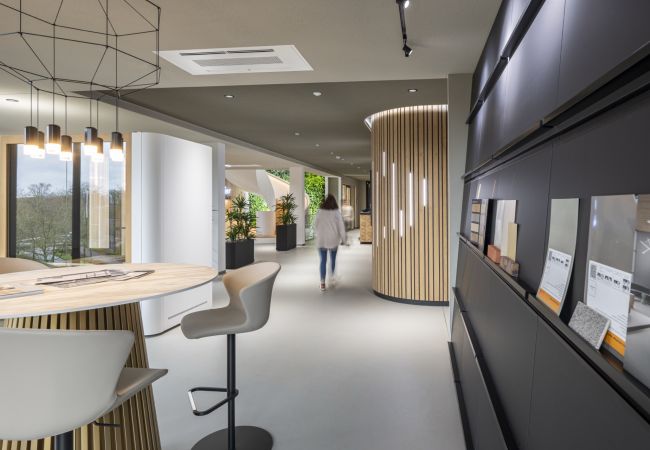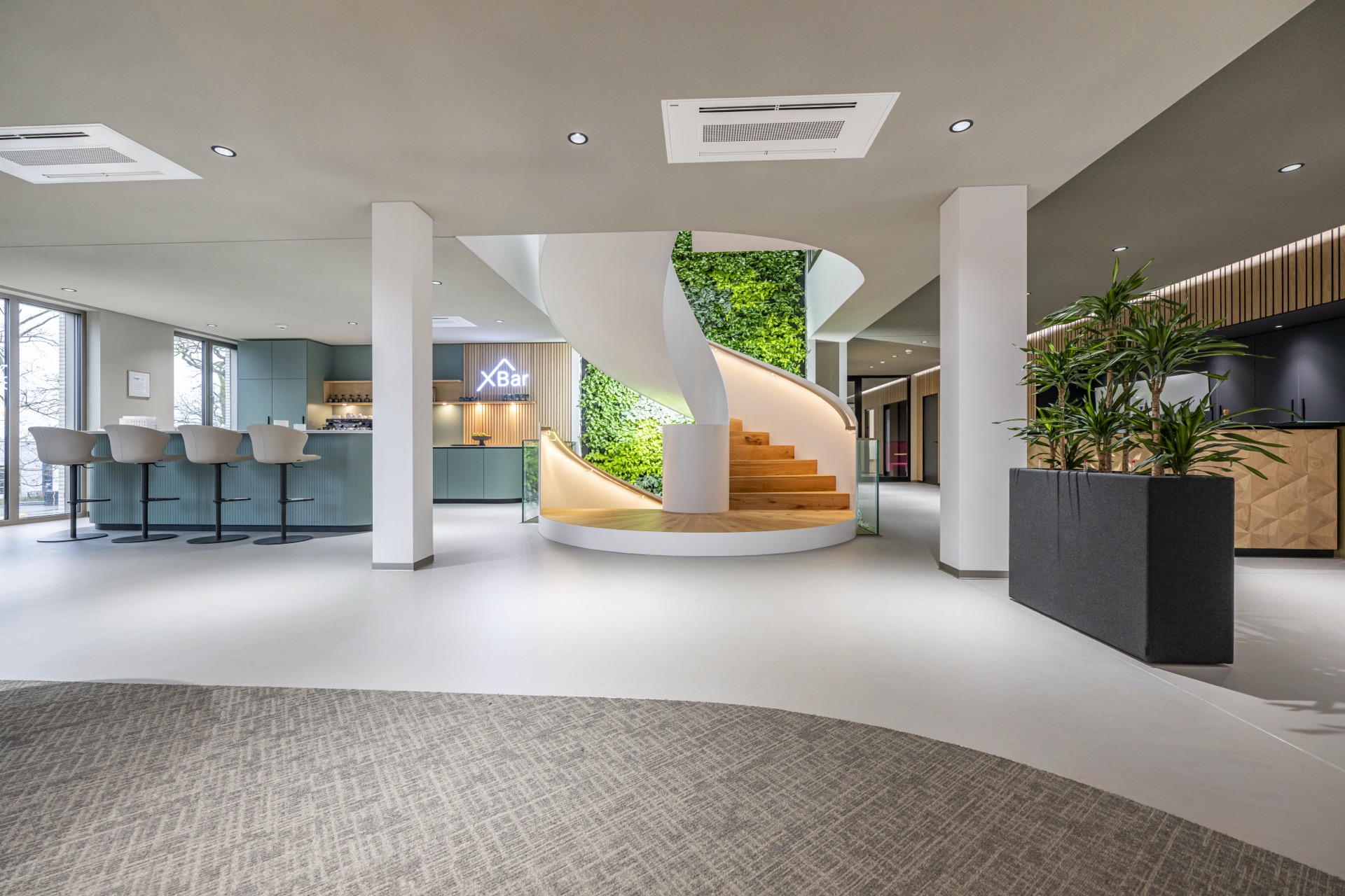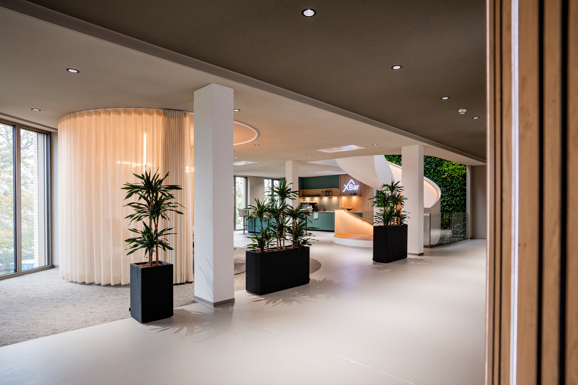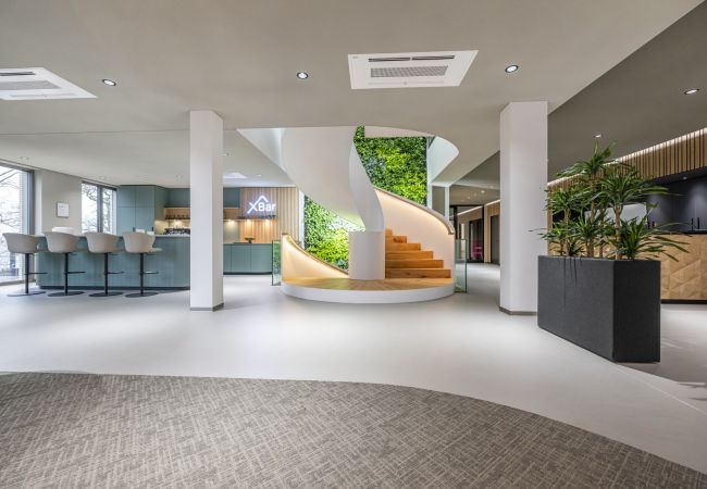 Das Gebäude besticht durch seine hochwertige Architektur mit klaren Linien, natürlichen Materialien und einer harmonischen Farbgestaltung. Unsere präzisen Handwerksleistungen haben maßgeblich dazu beigetragen, dass die Innenräume eine besondere Atmosphäre ausstrahlen – von den großzügigen Arbeitsbereichen über die stilvollen Gemeinschaftszonen bis hin zu der beeindruckenden X-Bar.